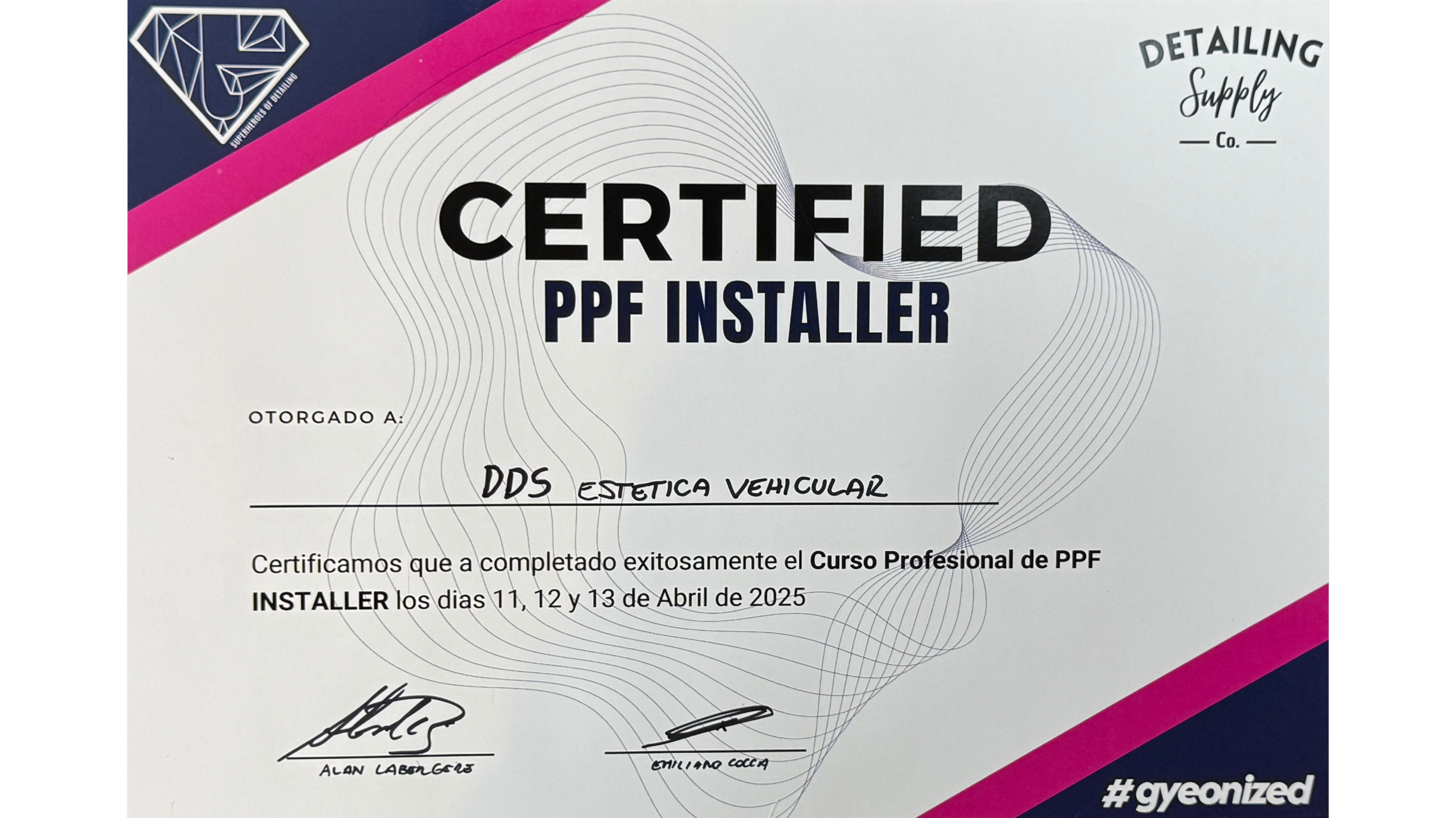 Certificados como Instaladores Oficiales GYEON PPF (verifica en gyeonservices.com/find-your-installer). Garantía Infinite en Enhance y Protect+ para máxima protección vehicular.
